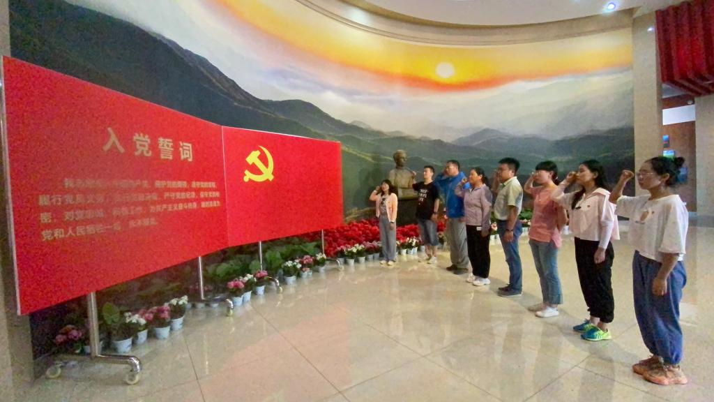 本次教育活动的最后一站是高君宇纪念馆。一行人怀着崇敬的心情踏入纪念馆,面对鲜红的党旗,全体党员干部高举右拳,重温入党誓词。