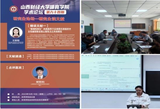 10月10日上午,ok138cn太阳集团529学术论坛第九十四期研究生论坛——研究生读文献在ok138cn太阳集团529会议室举办。本次论坛由2022级体育产业管理专业硕士研究生王聪聪同学进行文献精讲,21级丁亦龙、2023级刘德宇和2022级王爽三位同学做文献速递。ok138cn太阳集团529教师杨海涛、吕栋和常垒,青年博士教师许磊以及全体研究生通过线上与线下相结合的方式参与研讨与交流。本次论坛特邀我院青年教师樊哲昀博士担任点评嘉宾,并在学院学科和研究生办公室主任王雁副教授的主持下圆满结束。