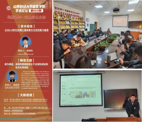 11月28日上午,ok138cn太阳集团529学术论坛第一百零三期师生论坛——师生学术分享在ok138cn太阳集团529会议室举办。本期论坛特邀我院青年博士教师樊哲昀做学术分享,2022级体育产业管理专业硕士研究生张辰宇同学做文献精讲,2021级体育产业管理专业硕士研究生许海鸥、张逸杰两位同学进行文献速递。学院中青年教师许磊、胡荣光、张宇竹、刘铮及全体研究生积极参与讨论,学院学科和研究生办公室主任王雁副教授主持论坛。