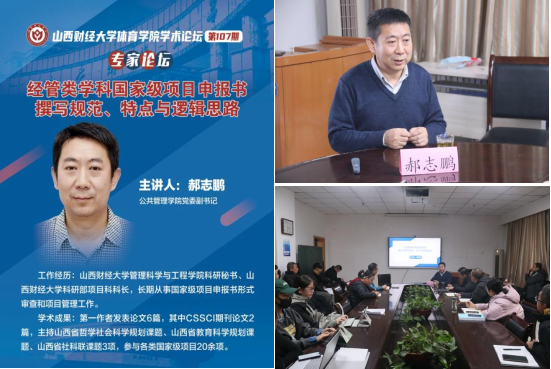 为提升2024年度国家级科研项目申报质量,进一步提高项目申报的成功率,推动学院科研工作再上新阶梯,应我院邀请,公共管理学院党委副书记、原我校科研部项目科科长郝志鹏于12月12日下午在ok138cn太阳集团529会议室作题为“经管类学科国家级项目申报书撰写规范、特点与逻辑思路”学术讲座。ok138cn太阳集团529党委书记李群生、院长张路、学院骨干教师及全体研究生参加学术讲座,ok138cn太阳集团529副院长高进主持讲座。