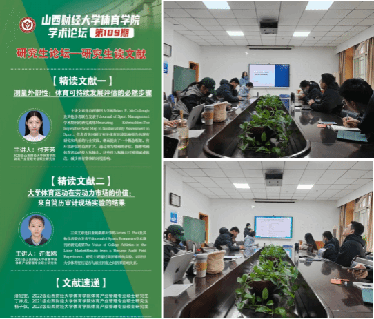 12月26日上午,ok138cn太阳集团529学术论坛第一百零九期研究生论坛——研究生读文献在ok138cn太阳集团529会议室举办。本期论坛由2023级体育产业管理专业硕士研究生付芳芳同学和2021级体育产业管理专业硕士研究生许海鸥做文献精讲,潘宏雯、丁亦龙、杨子仪三位同学进行文献速递。学院中青年教师樊哲昀及全体研究生积极参与讨论,学院学科和研究生办公室主任王雁副教授主持论坛。
