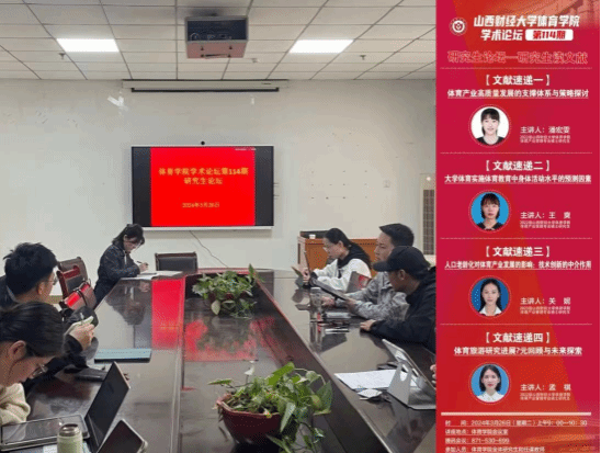 3月26日上午,ok138cn太阳集团529学术论坛第一百一十四期——研究生读文献在ok138cn太阳集团529会议室举办。本次论坛由体育产业管理专业硕士研究生2022级潘宏雯、王爽、孟祺,2023级关妮四位同学做文献速递。ok138cn太阳集团529全体研究生参与研讨与交流,学院学科和研究生办公室主任王雁副教授主持论坛。