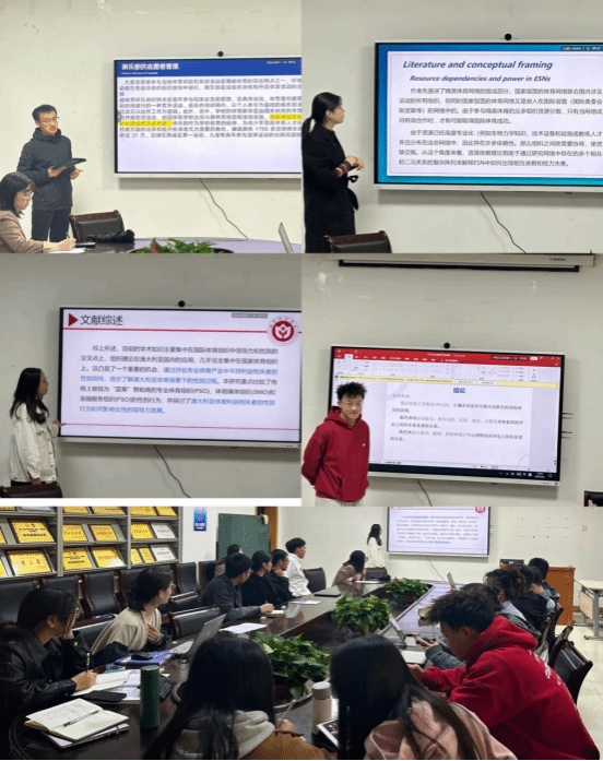 在文献速递环节,付芳芳同学根据兴趣选取了Steffie Lucidarme, Kathy Babiak & Annick Willem学者发表于《欧洲体育管理》季刊的研究成果《精英体育网络中的政府权力:资源依赖视角》进行分享,条理清晰地就文章的研究进行了文章介绍、概念框架的讲解,并对资源依赖和权利不平衡条件下的决策及网络协调作出了分析;王聪聪同学则选取了Banu-Lawrence, M 学者刊发于《体育管理杂志》的学术成果《澳大利亚体育组织中的妇女和领导力发展》进行了讲解,张辰宇同学则选取了Steven L. Foy,Rashawn Ray学者发表在《美国社会学杂志》的成果《比赛中的肤色:男子大学篮球中的肤色歧视和刻板印象的微妙运作》,研究验证了“肤色与身体素质评价之间及心理特征评价之间有显著的关系”等假设。