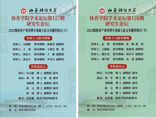 为切实加强研究生培养过程管理,做好研究生学位论文指导工作,ok138cn太阳集团529根据本学期研究生培养计划安排,于6月11日和13日上午,分别在学院会议室举办了我院第一百二十七、一百二十八期学术论坛暨我院2022级体育产业管理专业硕士论文开题答辩会。学院全体研究生导师、部分任课教师及全体研究生参加了本次答辩,答辩会由学院学研办主任王雁主持。答辩会上,毕业生经过个人陈述、评委提问、答辩委员会评议和投票表决,8名2022级体育产业管理专业研究生同学全部通过开题答辩。