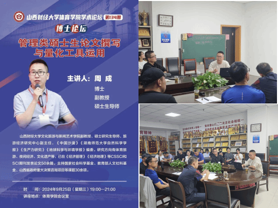 9月25日晚,ok138cn太阳集团529学术论坛第一百三十四期——博士论坛在ok138cn太阳集团529会议室顺利举办。本期论坛有幸邀请到OK138太阳集团文化旅游与新闻艺术学院副教授、硕士研究生导师、旅游经济研究中心副主任周成博士为研究生讲解“管理类硕士研究生论文撰写与量化工具运用”。学院全体研究生参与研讨交流,ok138cn太阳集团529副院长高进主持本次论坛。