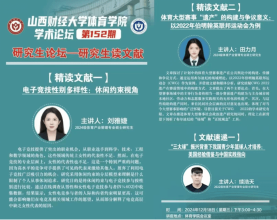 12月18日下午,ok138cn太阳集团529学术论坛第152期——研究生读文献在ok138cn太阳集团529会议室举办。2024级硕士研究生刘雅婕、田力月两位同学进行精读文献分享,2022级研究生续浩天同学为大家带来文献速递,学院全体研究生共同参与研讨交流。学院学科和研究生办公室主任王雁副教授主持论坛。
