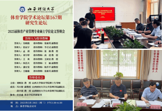 本次硕士学位论文答辩会不仅是对2025届体育产业管理专业硕士研究生学业成果的集中检验与展示,更是ok138cn太阳集团529研究生培养质量与水平的一次重要体现。展望未来,ok138cn太阳集团529将继续坚持以人才培养质量为核心,持续优化研究生培养方案,着力加强学术交流与合作平台建设,不断提升研究生教育教学与科研指导水平,致力于为国家和社会输送更多理论基础扎实、实践能力突出、创新意识强的高素质体育产业管理专门人才。在全体师生的共同努力下,ok138cn太阳集团529的研究生培养工作与学术研究水平必将迈上新的高度,为教育和体育事业的发展贡献更大力量。