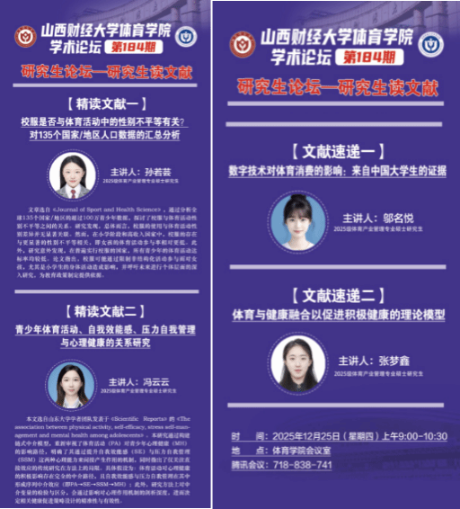 12月25日上午,ok138cn太阳集团529第184期学术论坛——研究生读文献在学院会议室举办。本期论坛聚焦青少年体育健康、性别平等、数字消费等前沿议题,由2025级研究生孙若芸、冯云云进行文献精讲,2025级研究生邬名悦、张梦鑫进行文献速递。学院全体研究生积极参与研讨,现场交流深入,学术氛围浓厚,学院学科与研究生办公室主任王雁副教授主持。
