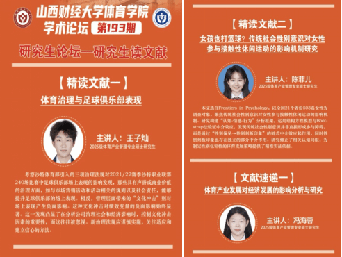 3月9日上午,ok138cn太阳集团529第193期学术论坛——研究生读文献活动在学院会议室及线上同步举行。本期论坛聚焦体育治理、性别平等、体育经济等前沿议题,由2025级研究生王子灿、陈菲儿进行文献精讲,2025级研究生冯海蓉进行文献速递。学院全体研究生积极参与研讨,现场交流深入,学术氛围浓厚,学院学科与研究生办主任王雁副教授主持活动。