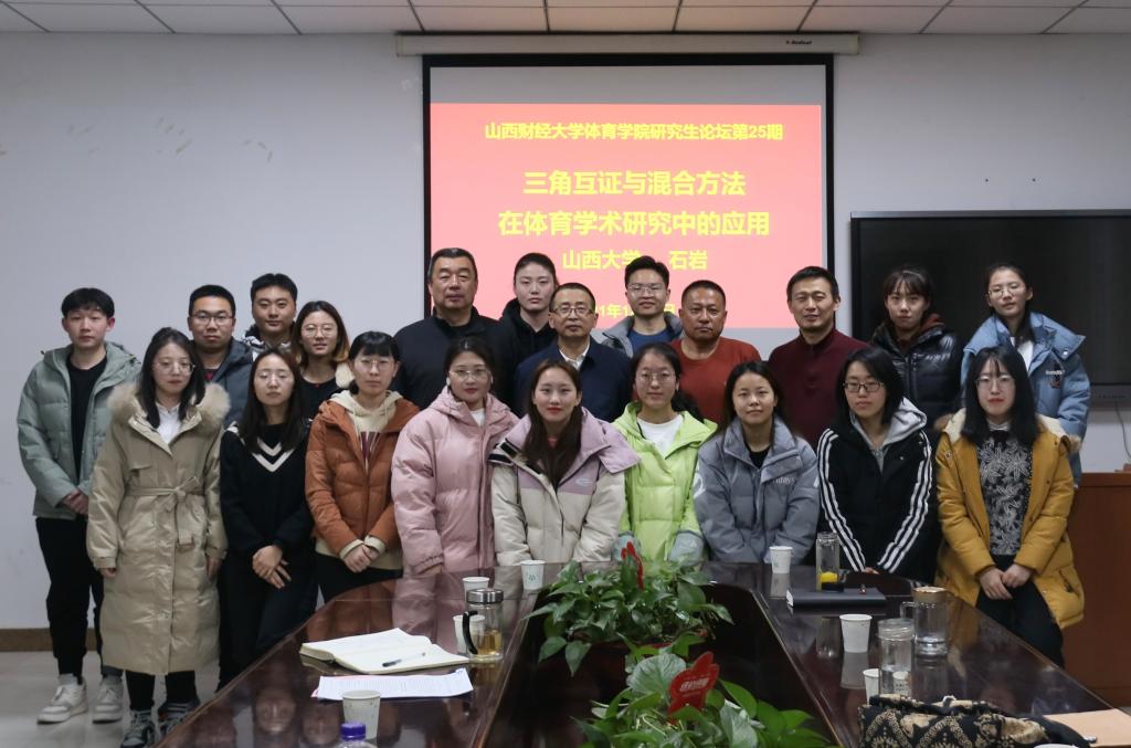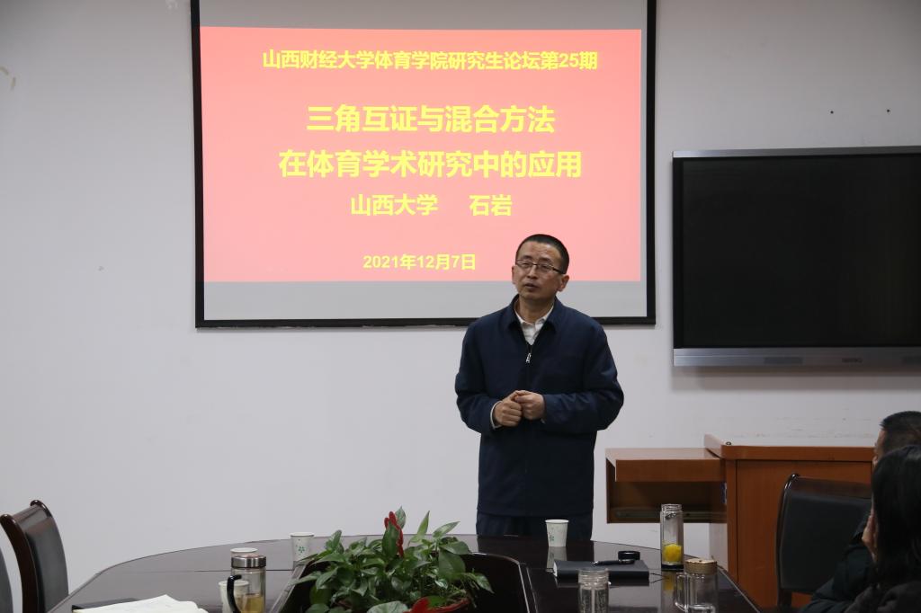 12月7日,应我院邀请,山西大学博士生导师石岩教授来到我校为我院研究生论坛第二十五期作了题为“三角互证与混合方法在体育学术研究中的应用”的报告。我院全体硕士研究生、全体硕士生导师及部分专业教师聆听了本次报告。