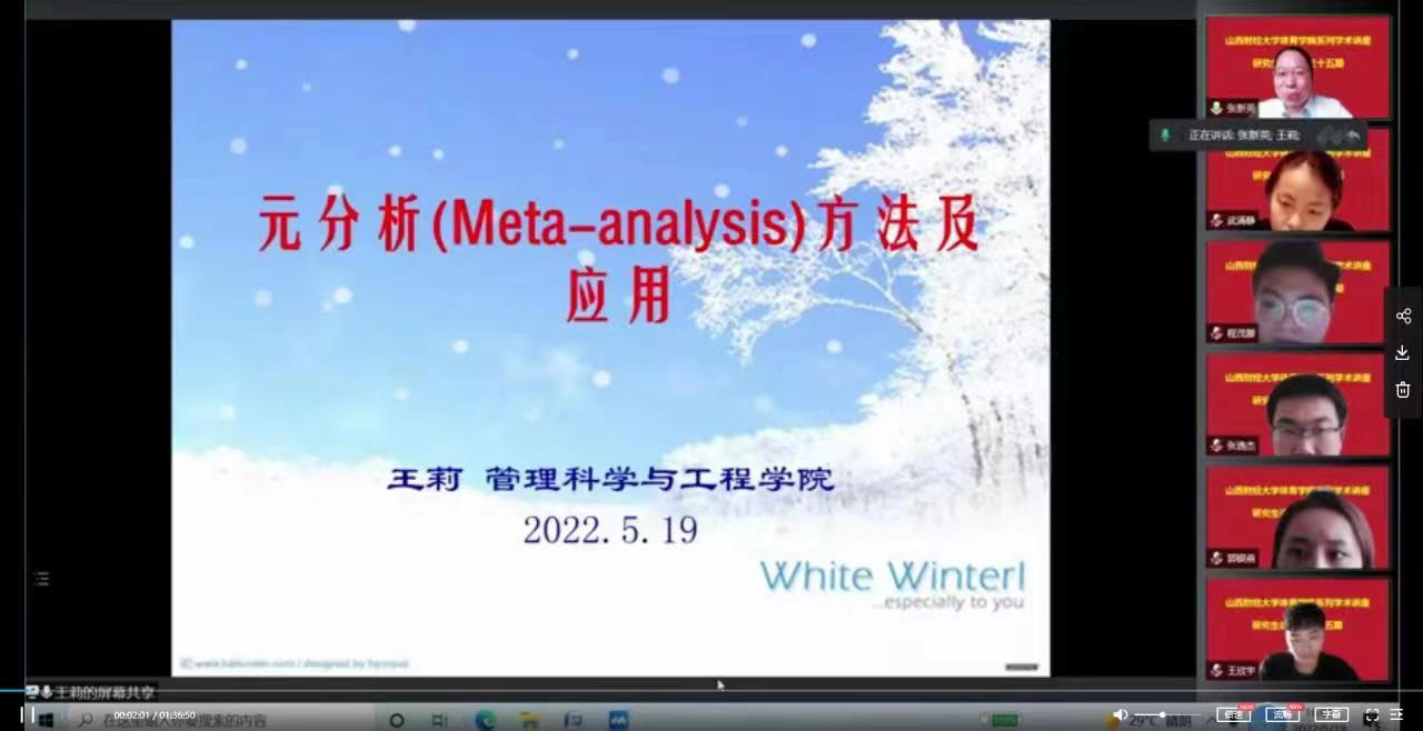 王莉围绕元分析的基本概念、元分析的基本过程、元分析的质量控制问题以及元分析软件及功能四个方面,并结合实际研究工作以及自己的经验,由浅入深地从元分析的优势与不足、元分析使用条件、元分析的研究过程与研究方法到元分析的分类进行了细致讲解,使参会师生对元分析这一新型研究方法有了更深入的认识。随后又以《中国企业逆向跨国并购整合过程的质性元分析研究》与《基于元分析的跨界搜索与企业创新绩效关系研究》两篇文章,对元分析方法的运用进行阐述。会上,王莉与师生分别就自己研究领域中遇到的问题与对元分析的疑惑进行了交流,并给出了具体建议。讲座现场学术氛围浓厚,深入的讨论令大家获益匪浅。