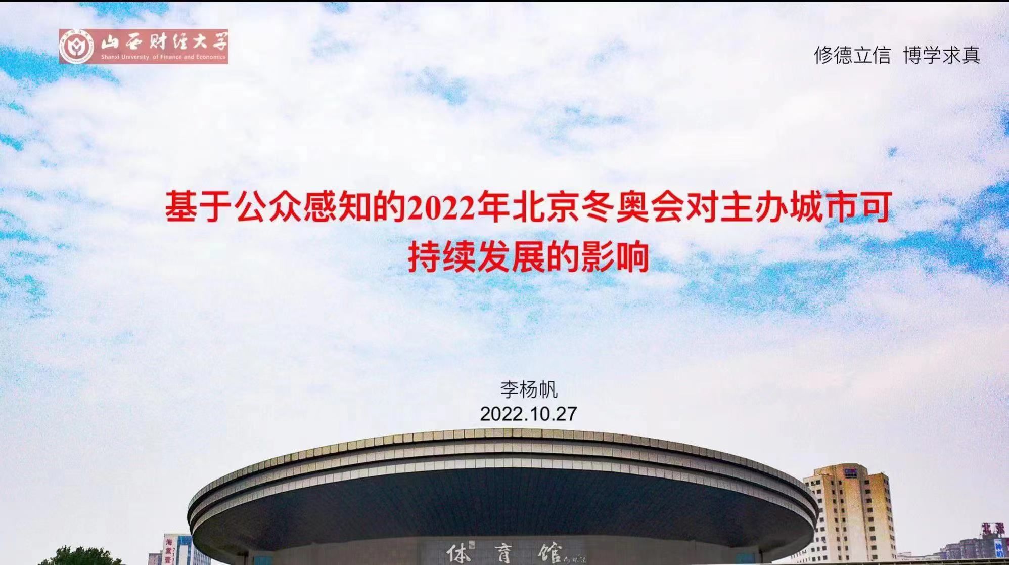 李杨帆同学的主题为“基于公众感知的2022年北京冬奥会对主办城市可持续发展的影响”,主讲文章来自中国科学院生态环境研究中心贺桂珍等人联合发表的Public Perceived Effects of 2022 Winter Olympics on Host City Sustainability,来自Sustainability期刊。文章通过对北京张家口地区806名当地居民的调查,分析了冬奥会对城市可持续发展的影响。
