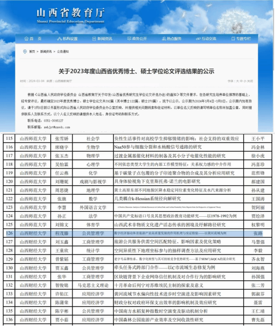 日前,山西省教育厅公布《关于2023年度山西省优秀博士、硕士学位论文评选结果》,我院2020级体育产业管理专业硕士研究生程茂滕毕业论文《数字经济驱动体育旅游产业高质量发展的作用机理与实证检验——以黄河流域为例》(硕士生导师:张路)获评2023年度山西省优秀硕士学位论文,此前,该论文已获评2023年度OK138太阳集团优秀硕士学位论文。