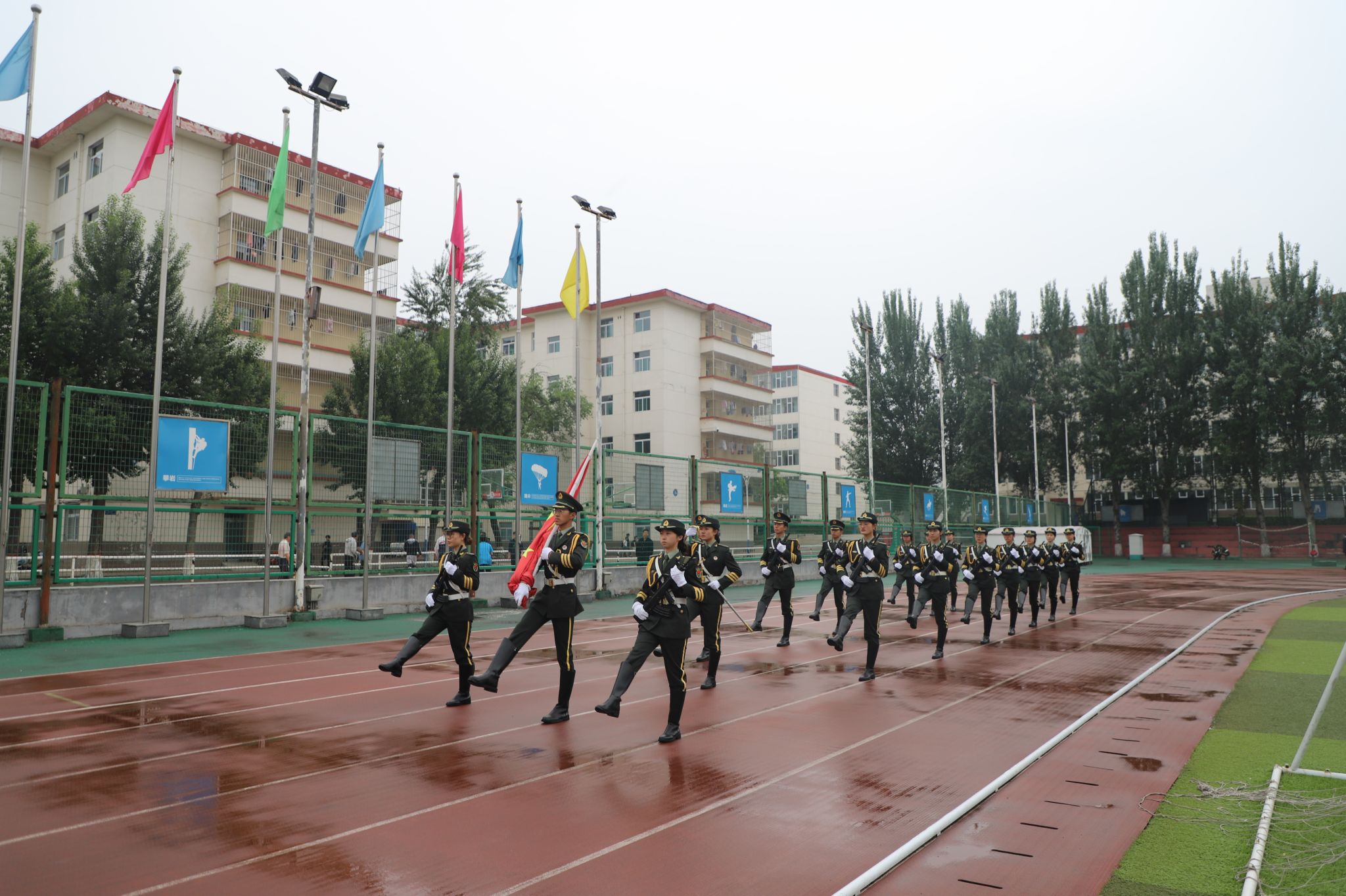致敬祖国,祝福母校。早上7时整,升国旗仪式正式开始。校国旗班队员气宇轩昂、目光坚定、步伐铿锵、护旗入场。国歌奏响,鲜艳的五星红旗冉冉升起,全体师生庄严注目、高唱国歌、向国旗致敬。向伟大的祖国表达深切的热爱之情,向亲爱的母校送上诚挚的生日祝福。