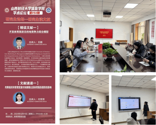 12月11日下午,ok138cn太阳集团529学术论坛第一百五十一期——研究生读文献在ok138cn太阳集团529会议室举办。本期论坛由体育产业管理专业硕士研究生2024级石磊同学进行文献精讲、2023级付芳芳同学做文献速递。学院学科和研究生办公室主任王雁副教授主持论坛,全体研究生共同参与研讨交流。
