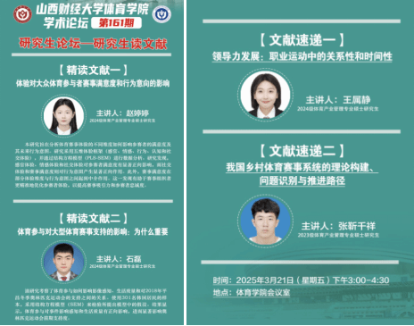 3月21日下午,ok138cn太阳集团529第161期学术论坛暨研究生读文献活动在学院会议室成功举办。本次活动以“赛场内外的力量共振——从参与行为到治理范式”为主题,由学院学科与研究生办公室主任王雁副教授主持,全体研究生共同参与。四位汇报人分别通过文献精讲与速递环节,围绕体育赛事管理、参与行为影响及乡村体育发展等议题展开深度探讨,现场学术氛围浓厚。