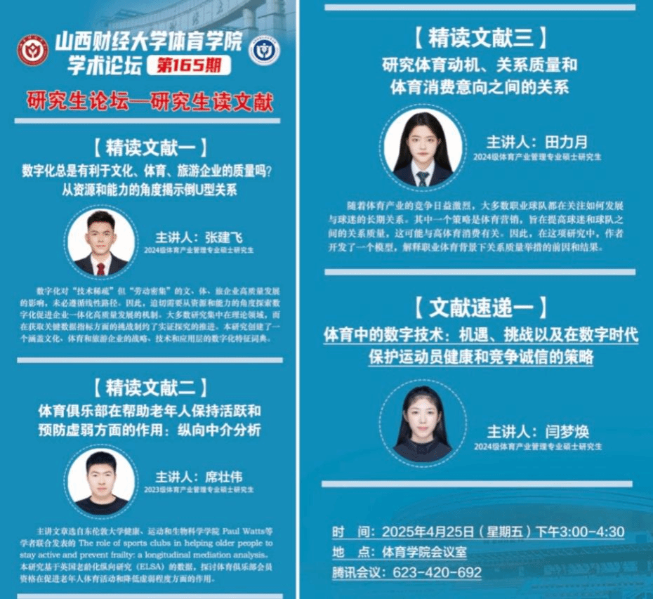 本次论坛紧扣研究生培养目标,通过文献精读与速递相结合的形式,强化了研究生对学术前沿的敏感度与批判性思维能力。学院将持续推进“文献研读+实践创新”双轨模式,以常态化活动助力研究生夯实理论基础、拓宽研究视野,为体育学科高质量发展培育新生力量。 (ok138cn太阳集团529 王属静供稿)