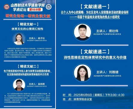 在文献速递环节,2023级研究生席壮伟分享了题为“以个人为中心的策略:为社区老年人安排集体活动的聚会场所——一项基于利益相关者视角的焦点小组研究”的前沿动态。研究强调老年人体育活动对积极应对老龄化的重要性,提出应通过提升其社会归属感、健康掌控感和决策参与度来赋能其体育参与。2024级研究生刘雅婕探讨了“诗性思维在定性体育研究中的意义与价值”。该研究引入“诗性思维”这一概念,倡导研究者超越固有解释框架,以更开放的态度面对研究过程的复杂性与未知性,挑战过度工具化和功利化的研究倾向,以期产出更具原创性、深度和社会价值的学术成果。